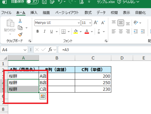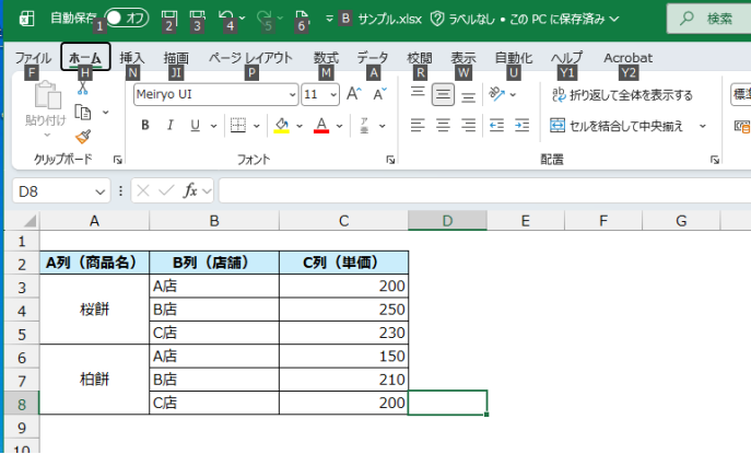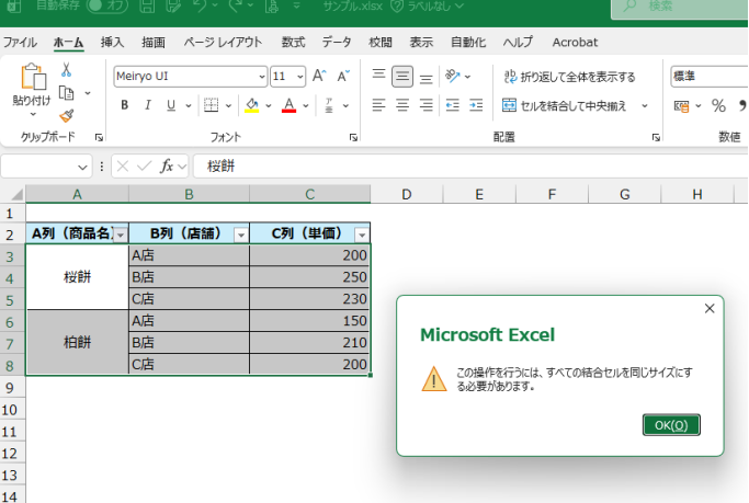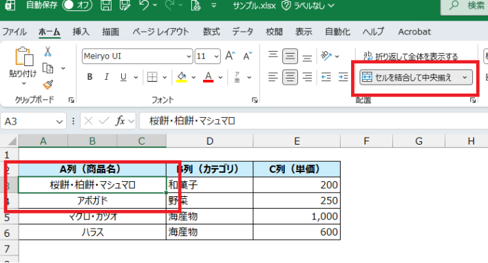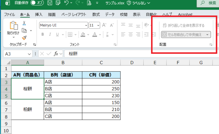 | 桜餅(A1:C1結合) | 桜餅(A1のみ) | B1・C1は空白 |