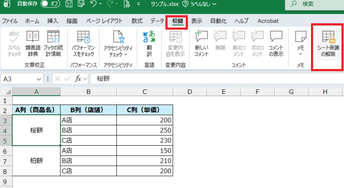 シートの保護が有効な場合は「校閲」タブの「シートの保護の解除」をクリックしてパスワードを入力し、保護を解除してからセルの結合解除操作を行います。