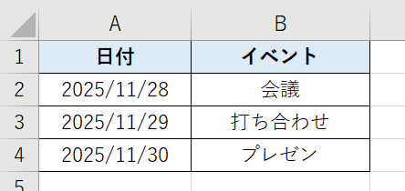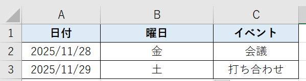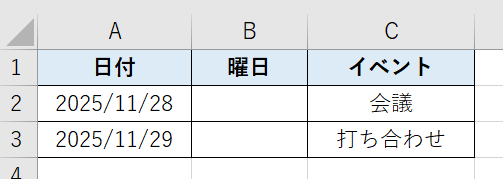 例えば、A列に日付データが入っていて、B列に曜日を表示したい場合を考えてみましょう。