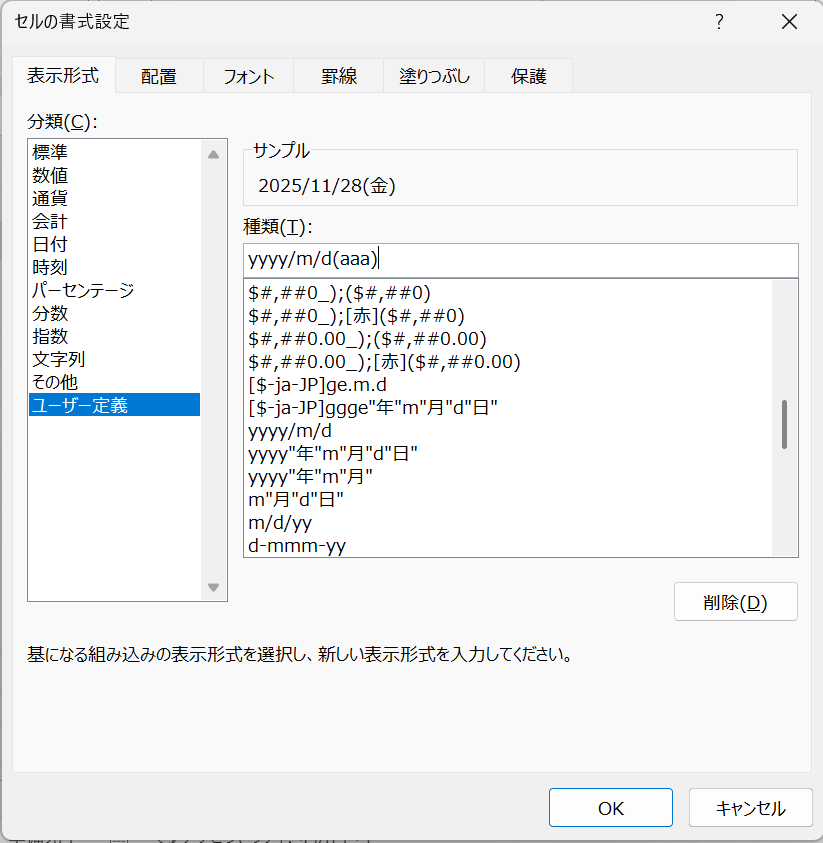 この方法なら、関数を使わずに日付データはそのまま保持しながら、見た目だけを「2025/11/28(木)」のように曜日付きで表示できます。