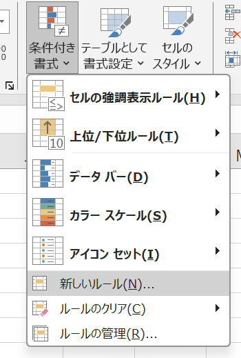 ホームタブの「条件付き書式」をクリックし、「新しいルール」を選択しましょう。