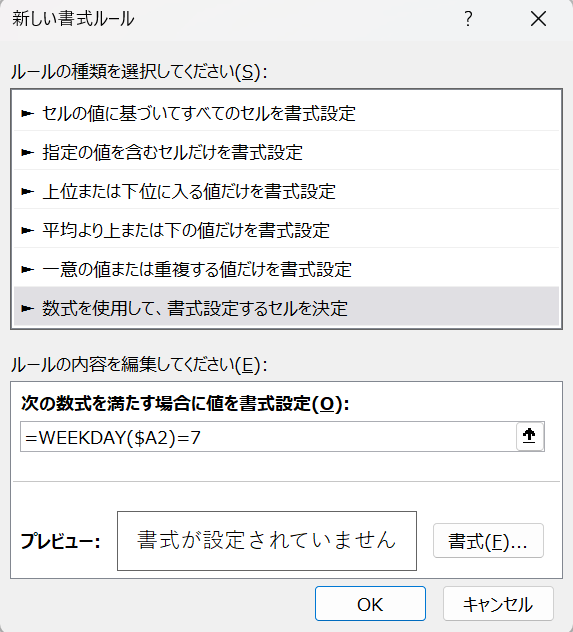 「次の数式を満たす場合に値を書式設定」の入力欄に、土曜日を判定する数式を入力します。