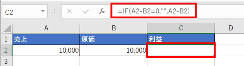 この数式では、「A2-B2が0に等しい場合は空白文字(””)を表示し、それ以外の場合はA2-B2の計算結果を表示する」という条件を設定しています。