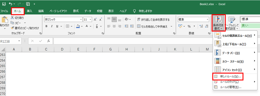 「ホーム」タブの「条件付き書式」をクリックし、「新しいルール」を選択しましょう。