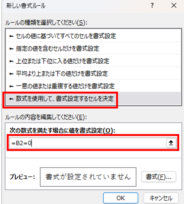 「ルールの種類を選択してください」で「数式を使用して、書式設定するセルを決定」を選択します。
