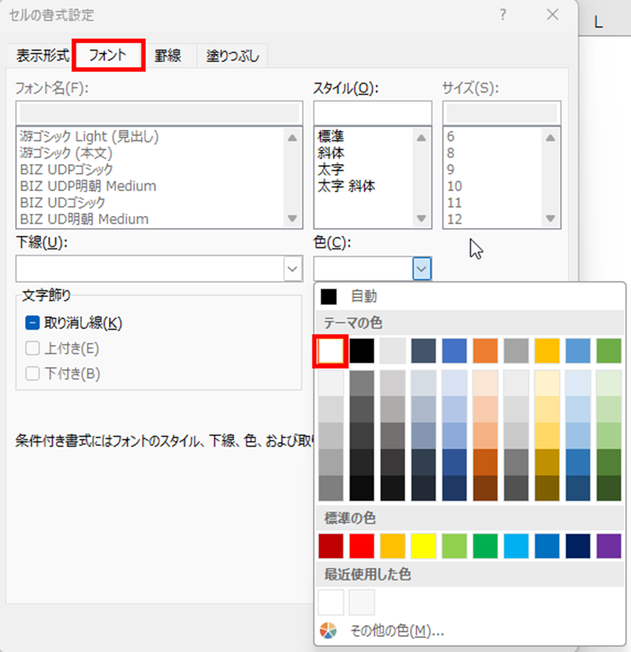 エクセルで0を表示しない方法4【条件付き書式でフォントを白にする】