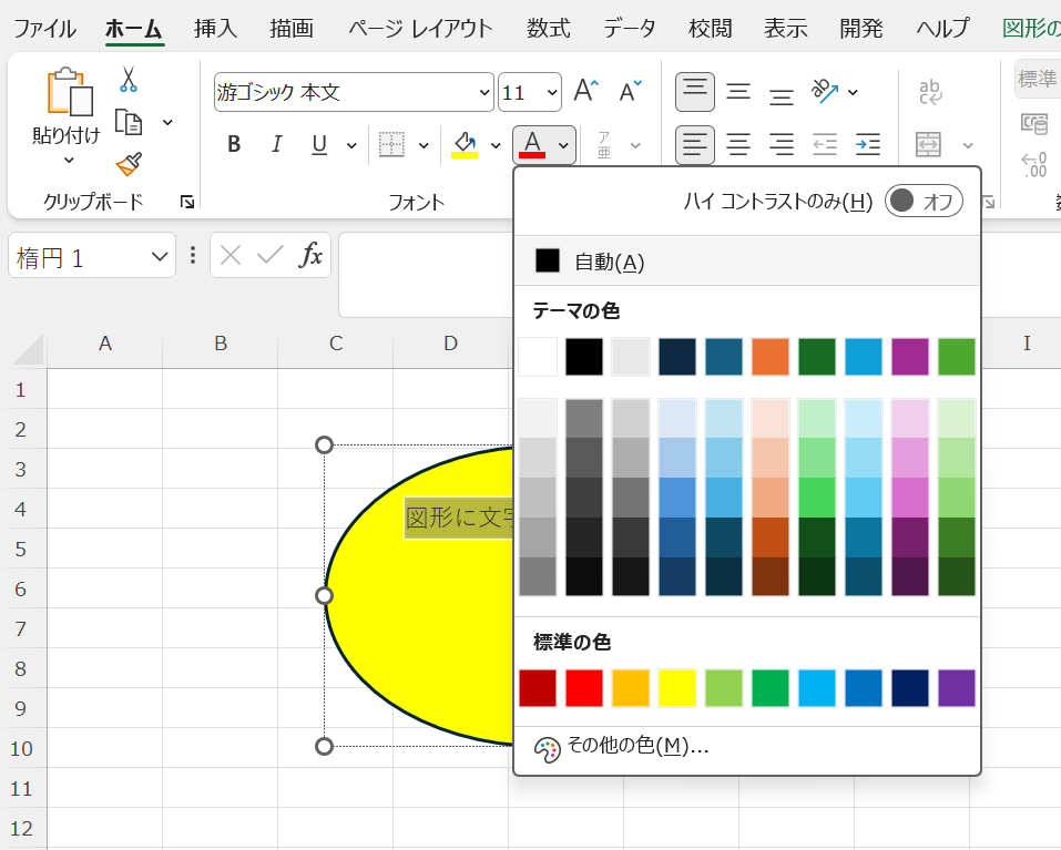 図形をダブルクリックまたは選択後にキーボード入力で文字入力モードに切り替わります。文字の書式はホームタブ、詳細設定は図形の書式設定のテキストオプションから調整できます。