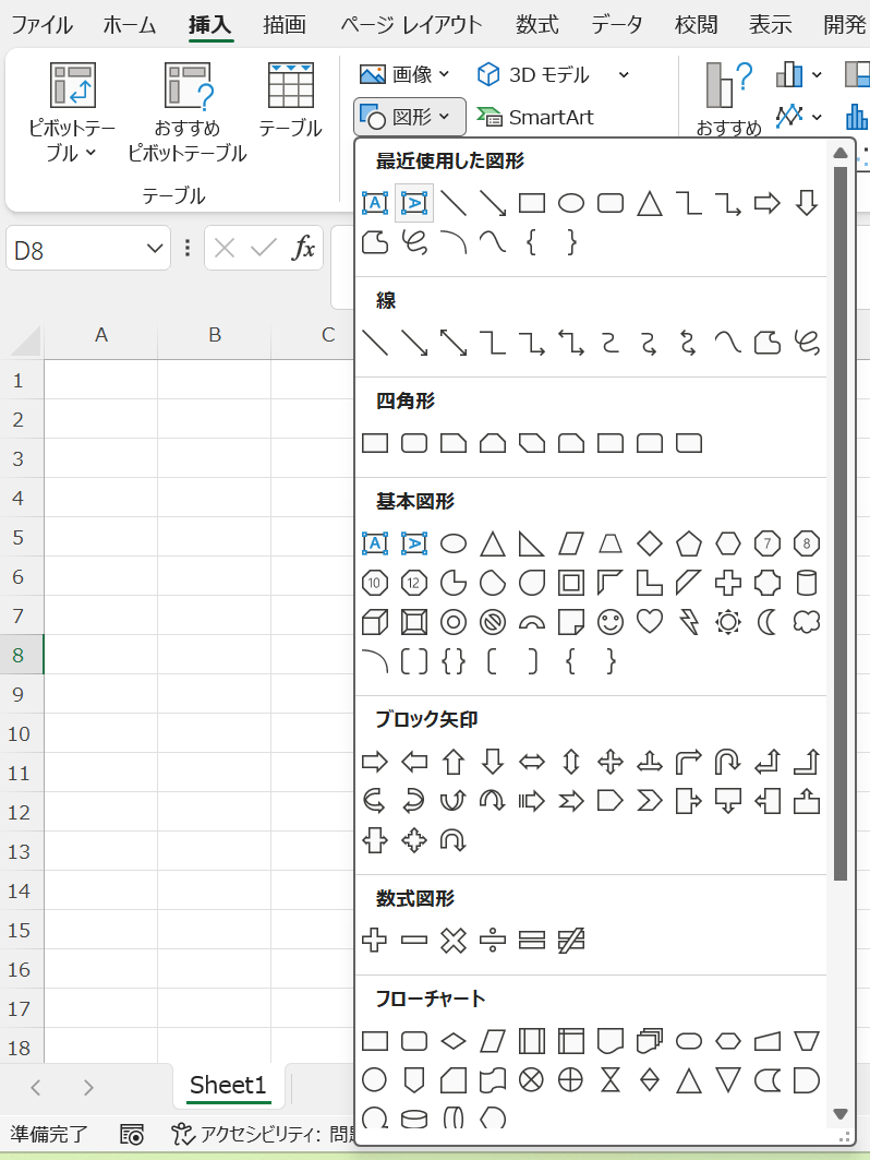 「挿入」タブの「図形」ボタンがグレーアウトしている場合は、セルが編集モード(セル内でカーソルが点滅している状態)になっている可能性があります。Escキーを押してセルの編集モードを終了してから再度操作しましょう。