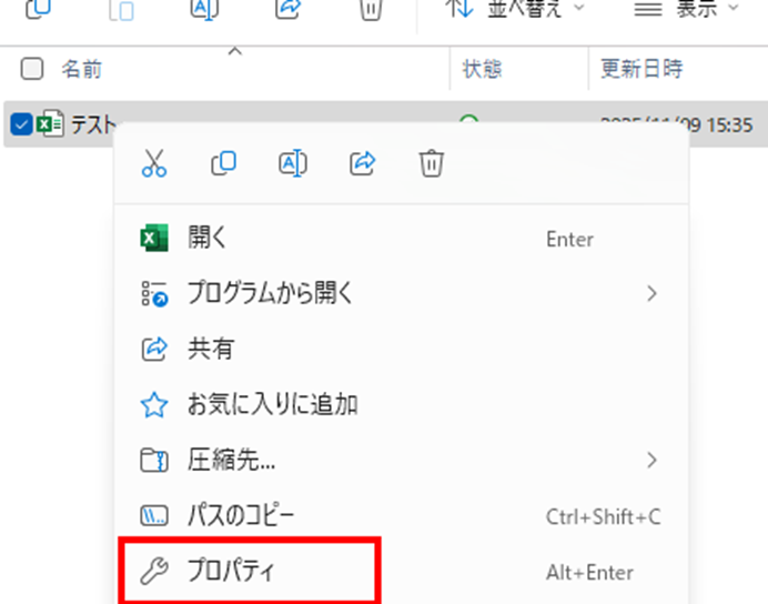 それでも開けない場合は、エクセルファイルを一度閉じてから、エクスプローラーで該当ファイルを右クリックして「プロパティ」を選択しましょう。