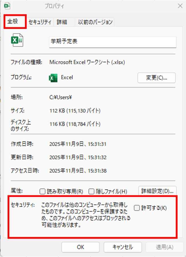 「全般」タブの下部に「セキュリティ」という項目があり、「このファイルは他のコンピューターから取得したものです。