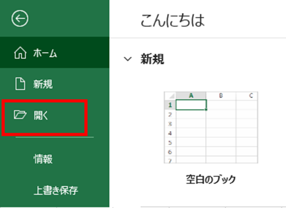 エクセルを起動して、「ファイル」タブから「開く」を選択します。