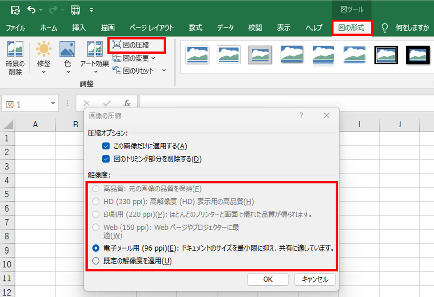 画像を選択して「図の形式」タブから「図の圧縮」を選択し、解像度を下げることでファイルサイズを大幅に削減できます。