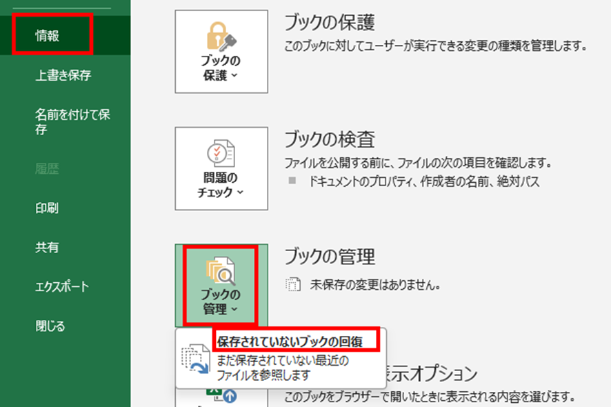 「ファイル」タブから「情報」を選択し、「ブックの管理」をクリックして「保存されていないブックの回復」を選択します。
