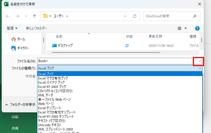 「ファイルの種類」ドロップダウンメニューから「Excelブック(.xlsx)」を選択して保存すると、最新の形式に変換されます。