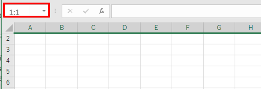 または、名前ボックス(数式バーの左側)に「1:1」と入力してEnterキーを押すことで、1行目を直接選択することもできます。