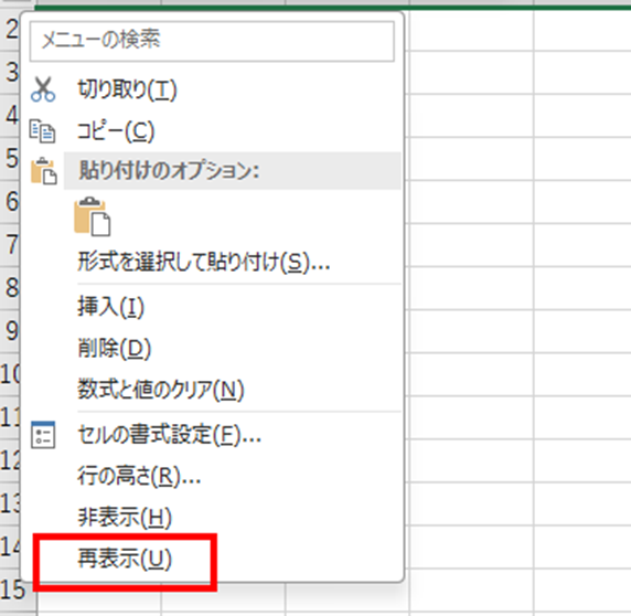 ・行の非表示解除:行番号の境界を選択して右クリックから再表示を選択