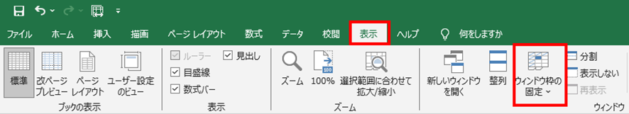 「表示」タブをクリックして「ウィンドウ枠固定」を選択します。