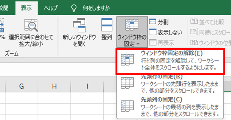 ドロップダウンメニューから「ウィンドウ枠固定の解除」をクリックしましょう。