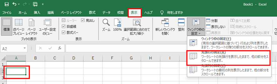 もし1行目を見出し行として固定したい場合は、セルA2を選択してから「表示」タブ→「ウィンドウ枠の固定」→「先頭行の固定」を選択すれば、1行目だけを固定できます。