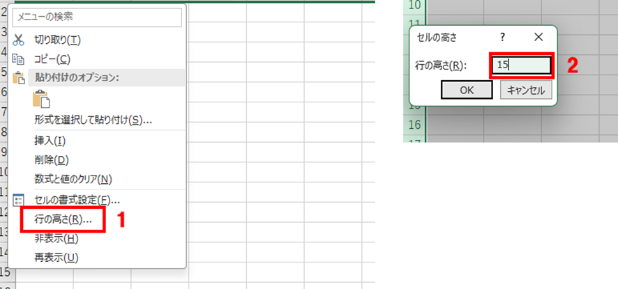 さらに確実な方法として、1行目を選択した状態で右クリックして「行の高さ」を選択し、数値(例えば15や18など)を入力して「OK」をクリックする方法もあります。