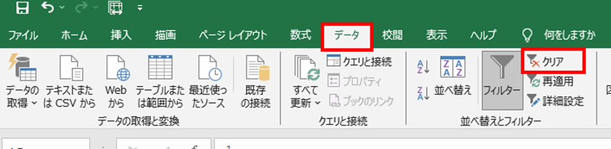 ・フィルターのクリア:データタブからフィルター条件をクリアして全行を表示