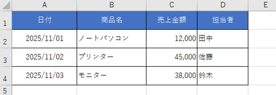 以下は、1行目のヘッダーが正しく表示されている売上データのサンプルです。