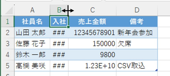 ・###の解消:列境界線をダブルクリックして列幅を自動調整
