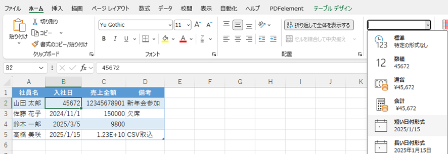 ・日付の数字化け:表示形式を「短い日付形式」または「長い日付形式」に設定