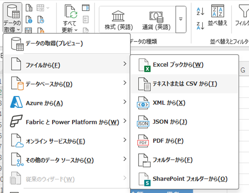 「データの取得」→「ファイルから」→「テキストまたはCSVから」