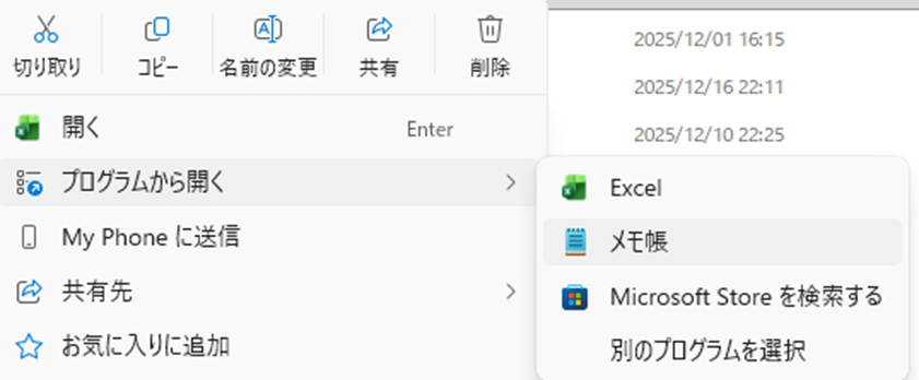「プログラムから開く」→「メモ帳」