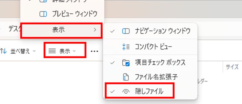 エクスプローラーの「表示」タブをクリックし、「隠しファイル」にチェックを入れて、隠しファイルを表示させましょう。