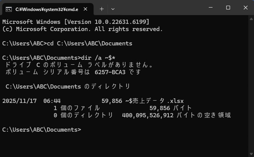 ・コマンドプロンプト:「del “~$ファイル名.xlsx”」コマンドで確実に削除