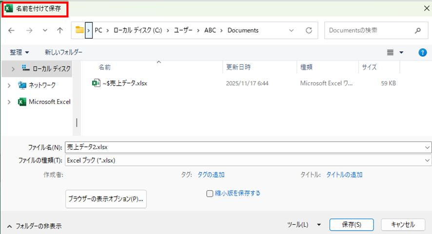 例えば、元のファイル名が「売上データ.xlsx」なら、「売上データ_修正版.xlsx」のような名前で保存します。