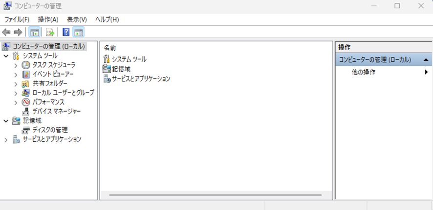 WindowsキーとRキーを同時に押して「ファイル名を指定して実行」を開き、「compmgmt.msc」と入力してEnterキーを押します。