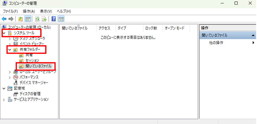 「コンピューターの管理」ウィンドウが開いたら、左側のツリーから「システムツール」→「共有フォルダー」→「開いているファイル」を展開します。