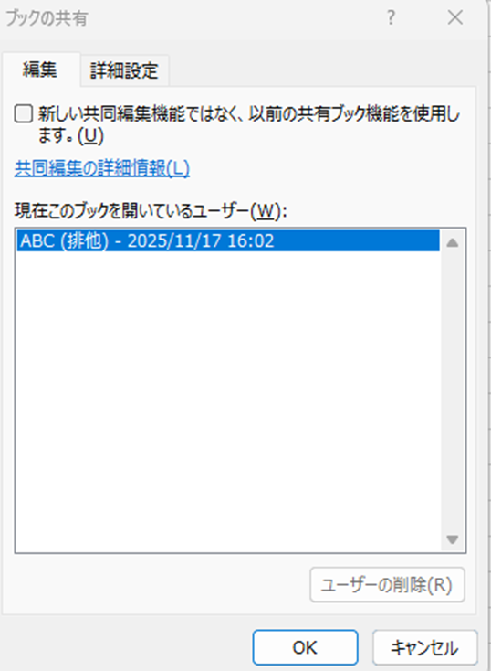 操作のポイント:校閲タブ→ブックの共有で現在のユーザーを確認。不要なセッションを削除したり、共有設定を解除できます。