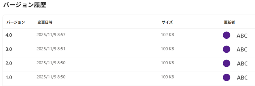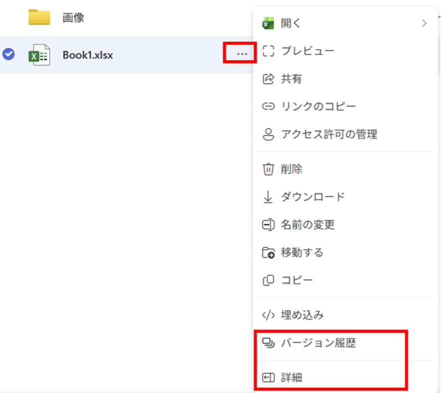 ファイルの横にある「…」(その他のオプション)をクリックし、「詳細」または「バージョン履歴」を選択します。