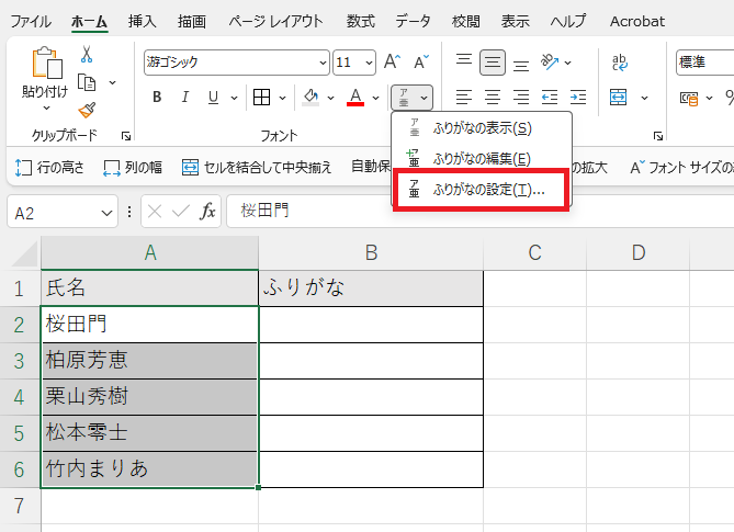 「ホーム」タブの「ふりがなの表示/非表示」右側の矢印をクリックし、「ふりがなの設定」を選択します。