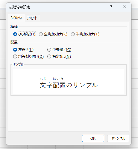 「ふりがな」タブの「種類」で「ひらがな」を選択して「OK」をクリックします。