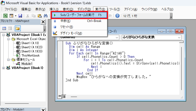 MsgBox "ひらがなへの変換が完了しました。"