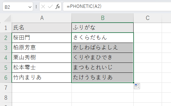 実行後にB列のPHONETIC関数の結果を確認すると、ひらがなで表示されていることが確認できます。