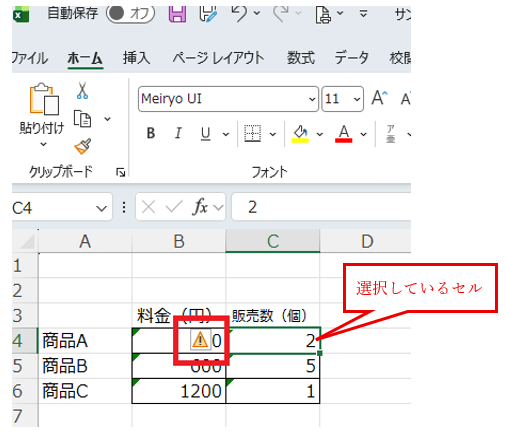 セルを選択すると、セルの左側に黄色い感嘆符マーク(エラーチェックオプションボタン)が表示されます。