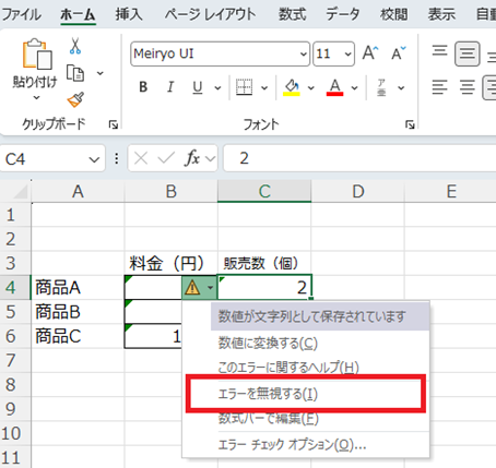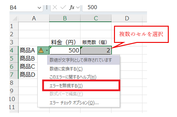 この感嘆符マークをクリックすると、ドロップダウンメニューが表示されます。メニューの中から「エラーを無視する」を選択してください。