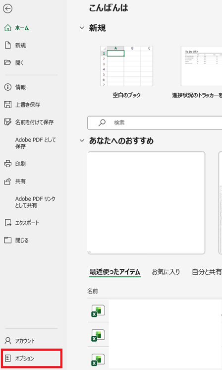 「ファイル」タブをクリックして「オプション」を選択しましょう。