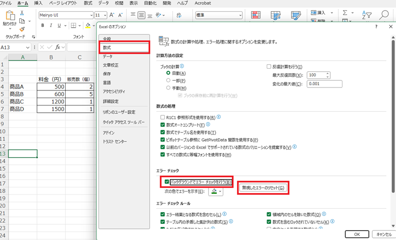 エクセルのオプション設定から、エラーチェック機能そのものを有効化することができます。