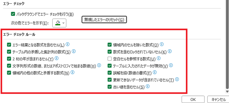 ただし感嘆符マークを選択してエラーマークを消したセルについては、「バックグラウンドでエラーチェックを行う」にチェックを入れた後に、右にある「無視したエラーのリセット」をクリックする必要がありますので、注意が必要です。