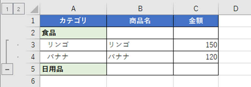 グループ化が完成すると、選択した行の左側(または列の上側)に折りたたみボタン(-)とレベル番号が表示されます。