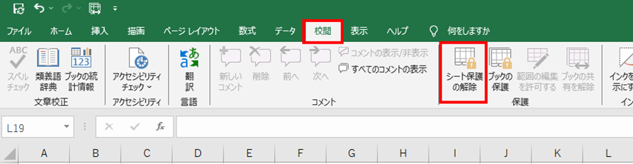 「校閲」タブをクリックして「シート保護の解除」ボタンを探します。