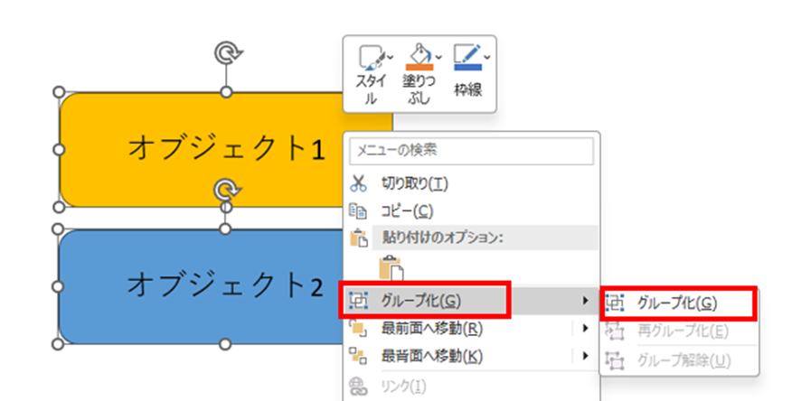 複数のオブジェクトが選択された状態(それぞれに選択ハンドルが表示される)で、選択したオブジェクトのいずれかを右クリックします。
