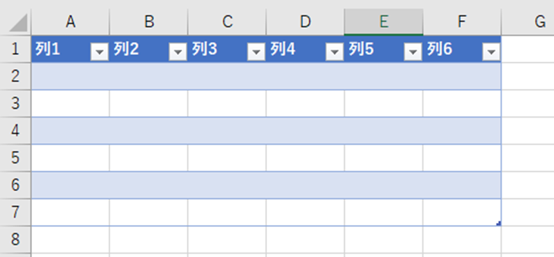 テーブルの場合、見出し行にフィルターボタンが表示され、テーブル全体に特殊な書式が適用されています。